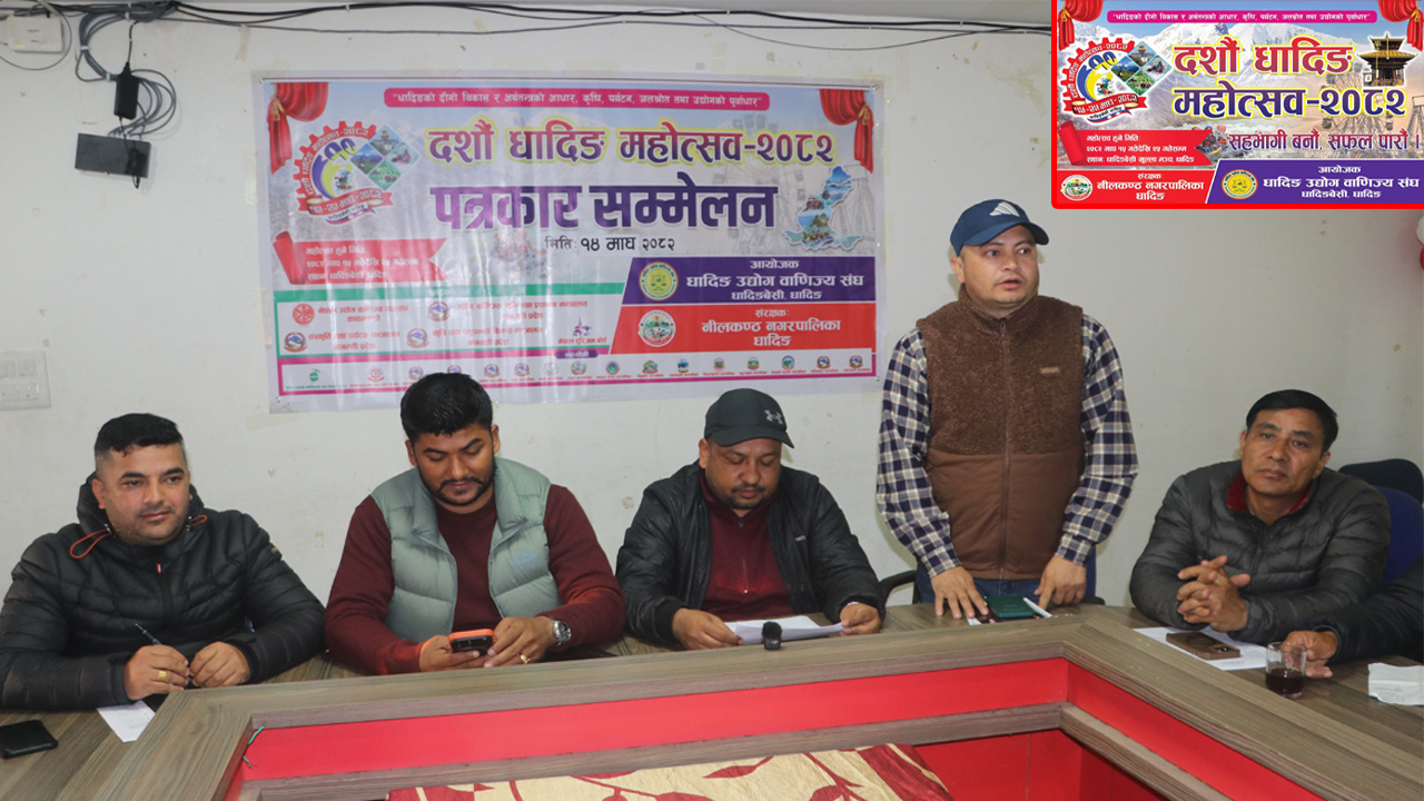 धादिङ । जिल्लाको कृषि, पर्यटन, उद्योग तथा सांस्कृतिक पहिचान प्रवर्द्धन गर्ने उद्देश्यका साथ दशौं धादिङ महोत्सव–२०८२ भोलि माघ १५ गतेदेखि धादिङबेसीमा सुरु हुँदैछ। १० दिनसम्म सञ्चालन हुने महोत्सवको उद्घाटन नेपाल उद्योग वाणिज्य महासंघका अध्यक्ष चन्द्रप्रसाद ढकालले गर्ने कार्यक्रम तय गरिएको छ।