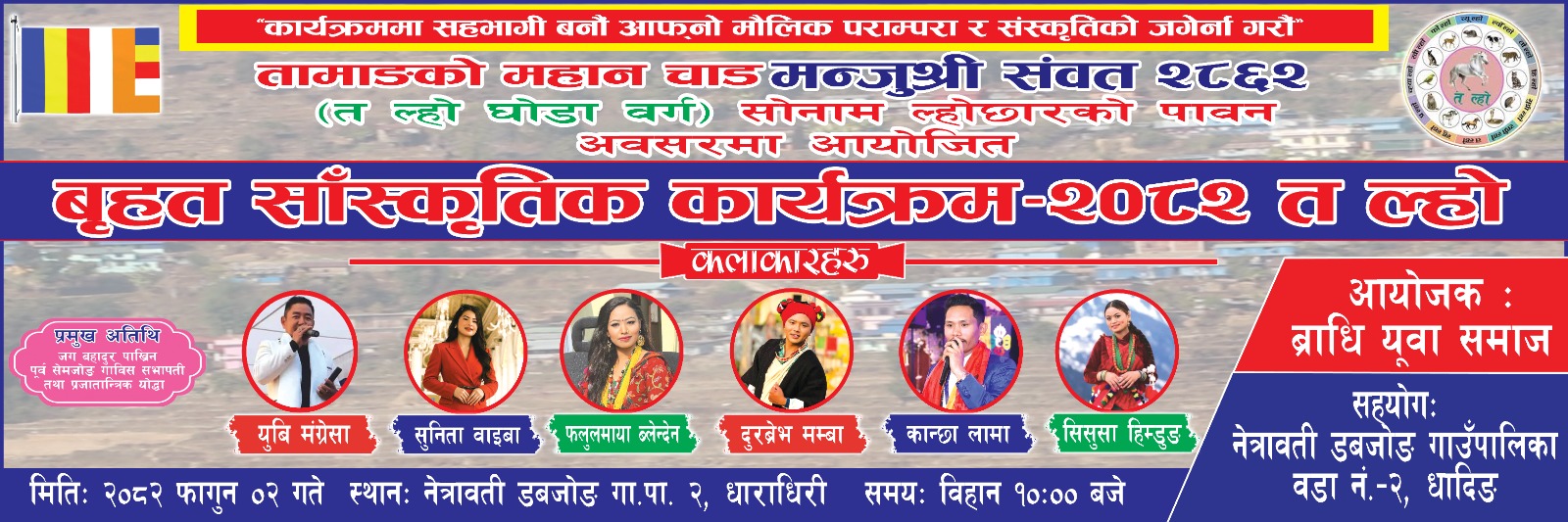 धादिङ जिल्लाको नेत्रावती डबजोङ गाउँपालिका–२, धाराधिरीमा यहि फाल्गुन २ गते शनिबार तामाङ समुदायको महान चाड मन्जुश्री संवत् २८६२ तथा त ल्हो(घोडा वर्ग)सोनाम ल्होछारको पावन अवसरमा भव्य बृहत् सांस्कृतिक कार्यक्रम–२०८२ आयोजना हुने भएको छ।